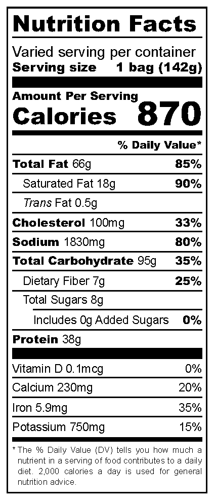 These meals weigh 5-6oz each and feed 1-2 people depending on the meal and activity level