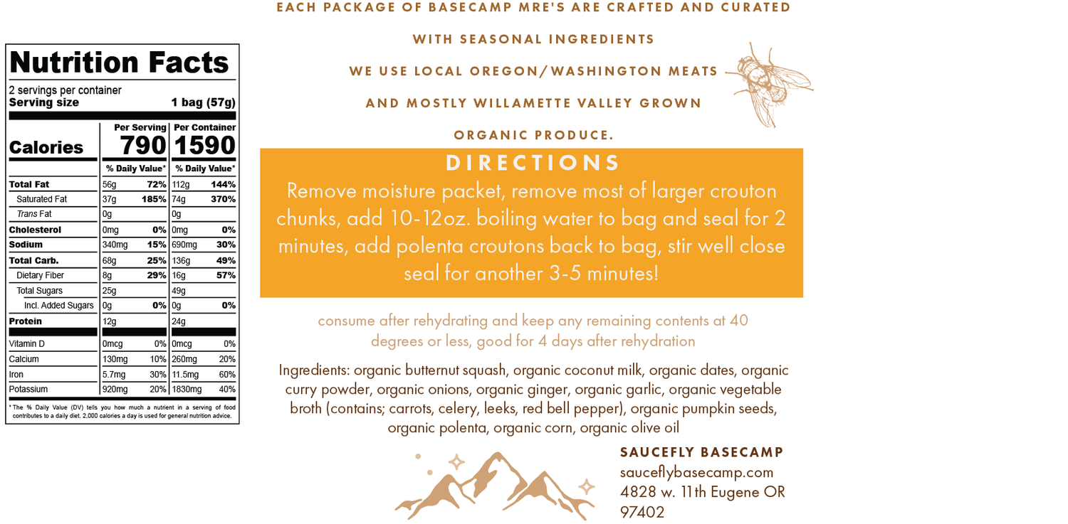 Organic butternut squash, organic coconut milk, organic dates, organic curry powder, organic onions, organic ginger, organic garlic, organic vegetable broth (contains; carrots, celery, leeks, red bell pepper), organic pumpkin seeds, organic polenta, organic corn, organic olive oil