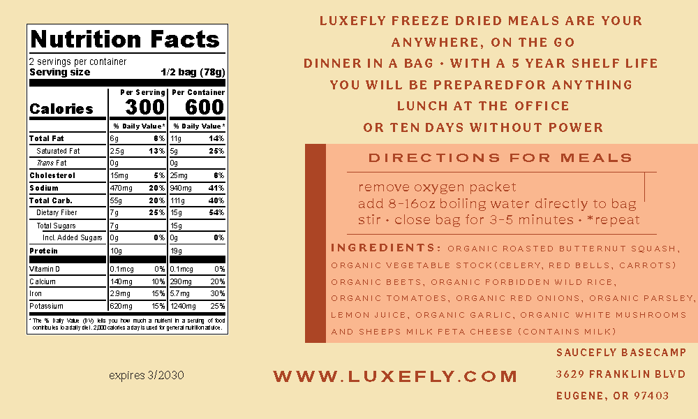 Organic butternut squash is slow roasted and rehydrates to taste almost exactly as it does when freshly made.